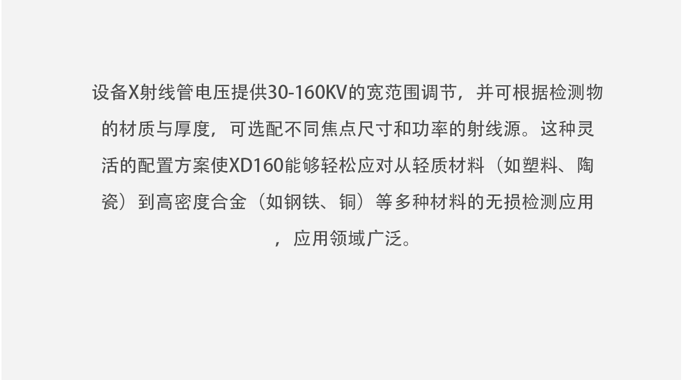 XD160是一款离线式X射线NDT检测设备,可360度任意视角检测,搭载创新自研智能检测软件具备测量尺寸、自编程步进检测等功能,适用于对各类铝铸件、五金制品、塑料制品、耐火材料和陶瓷体等各种中小型产品进行无损检测。