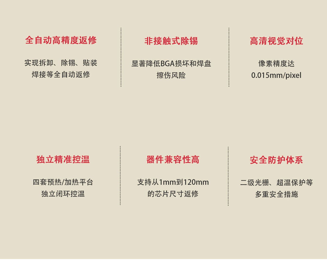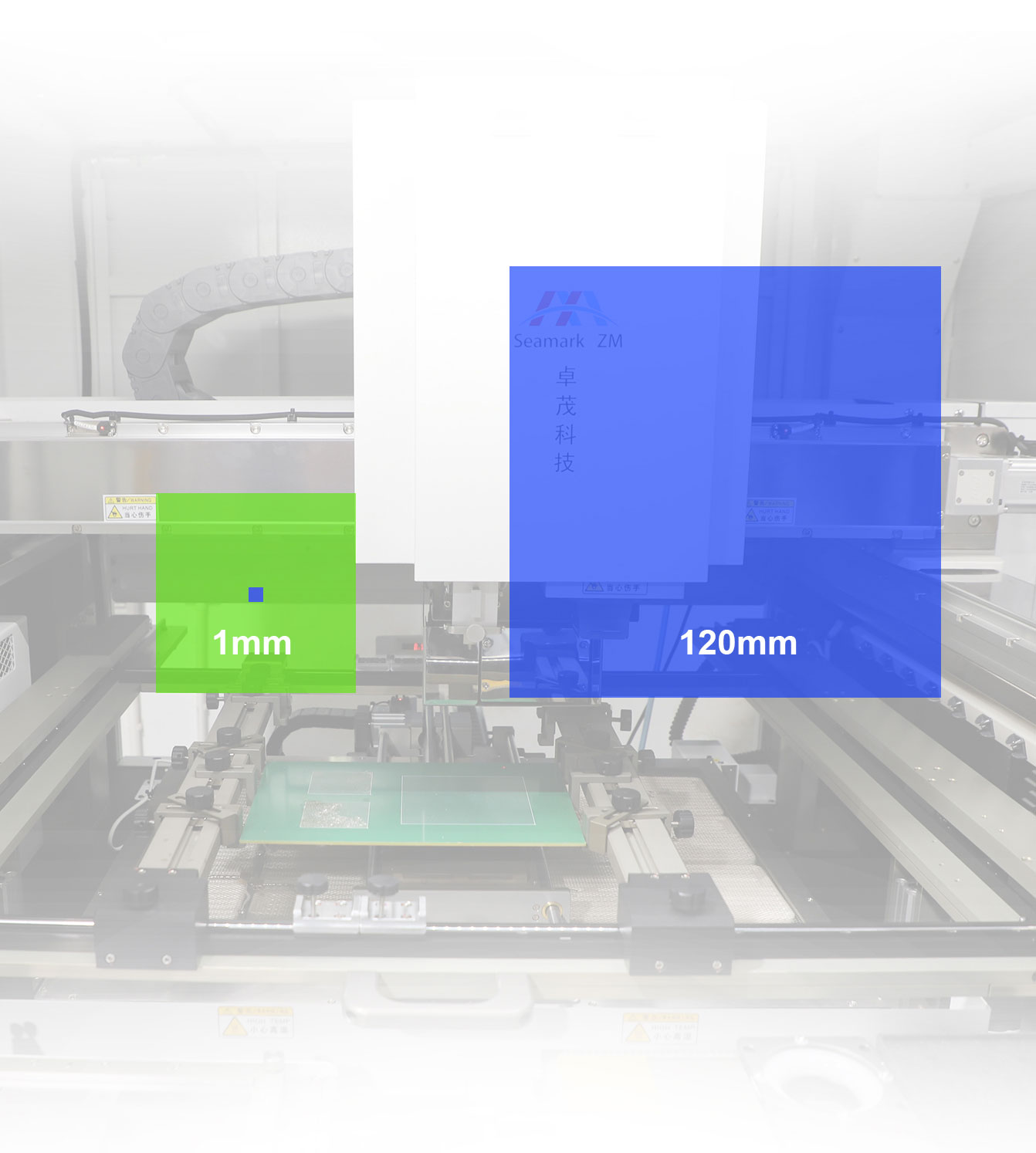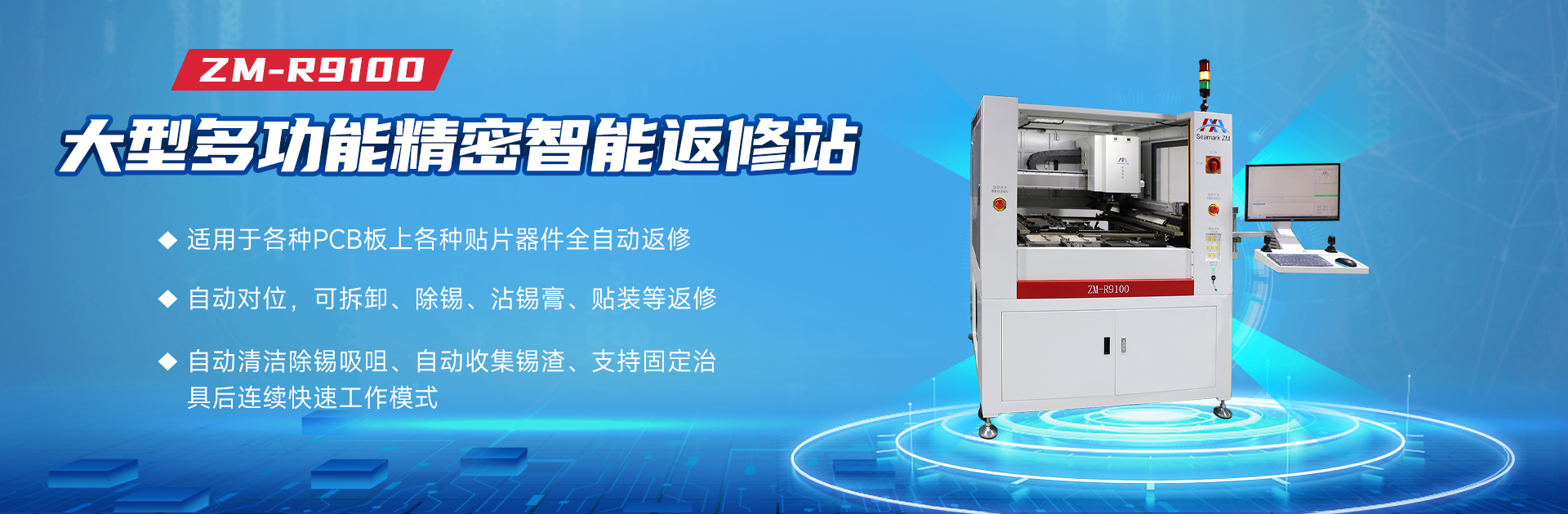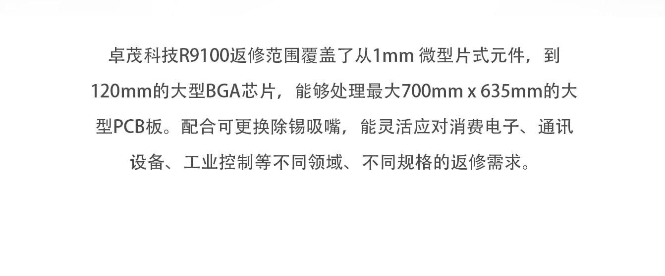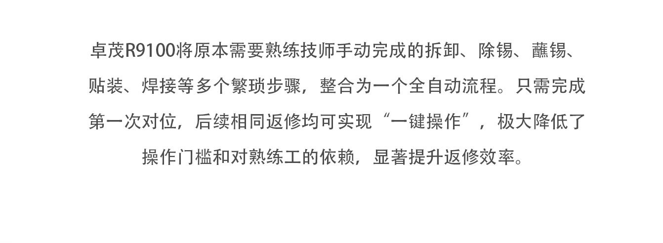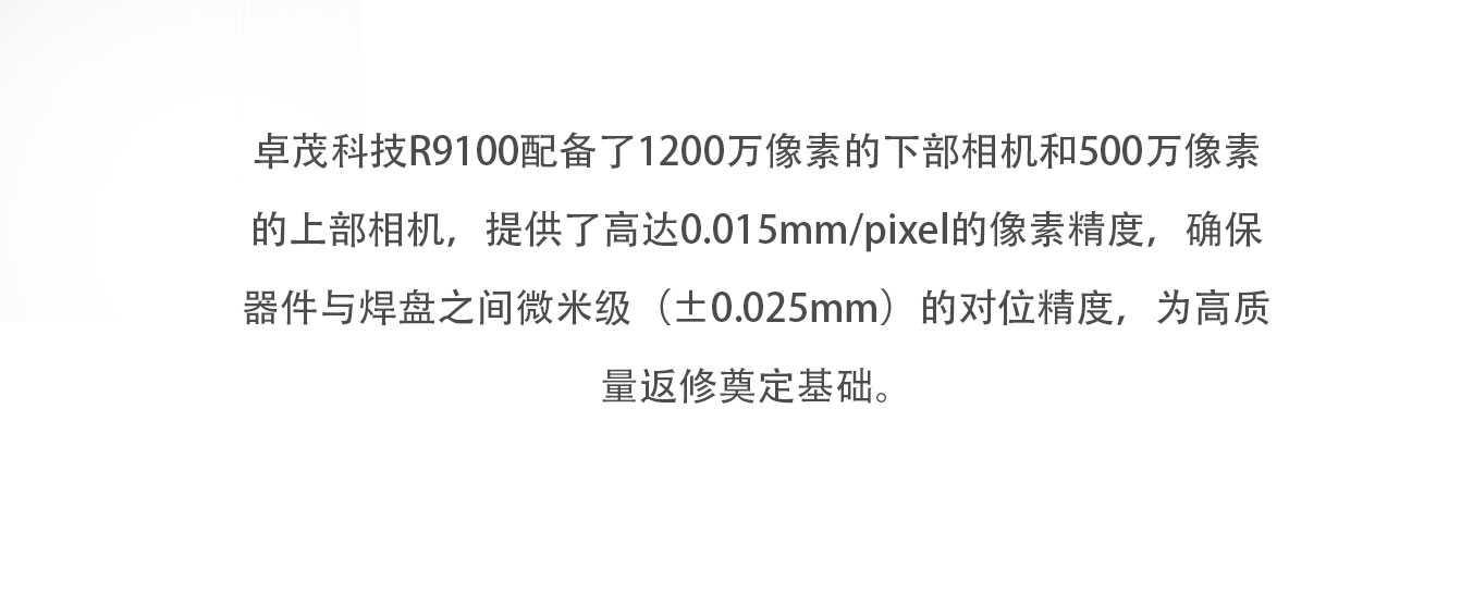 ZM-R9100是一款大型多功能精密智能返修站,适用于各种PCB板上各种贴片器件的全自动返修工作,采用高精度视觉相机和独立控温技术,通过设备视觉系统自动对位,实现拆卸、除锡、蘸锡膏、贴装、焊接等返修动作,支持固定治具后连续快速工作模式等功能;设备可与MES实现软件对接(选配),实现S/N为追溯条件的温度曲线分析等功能。