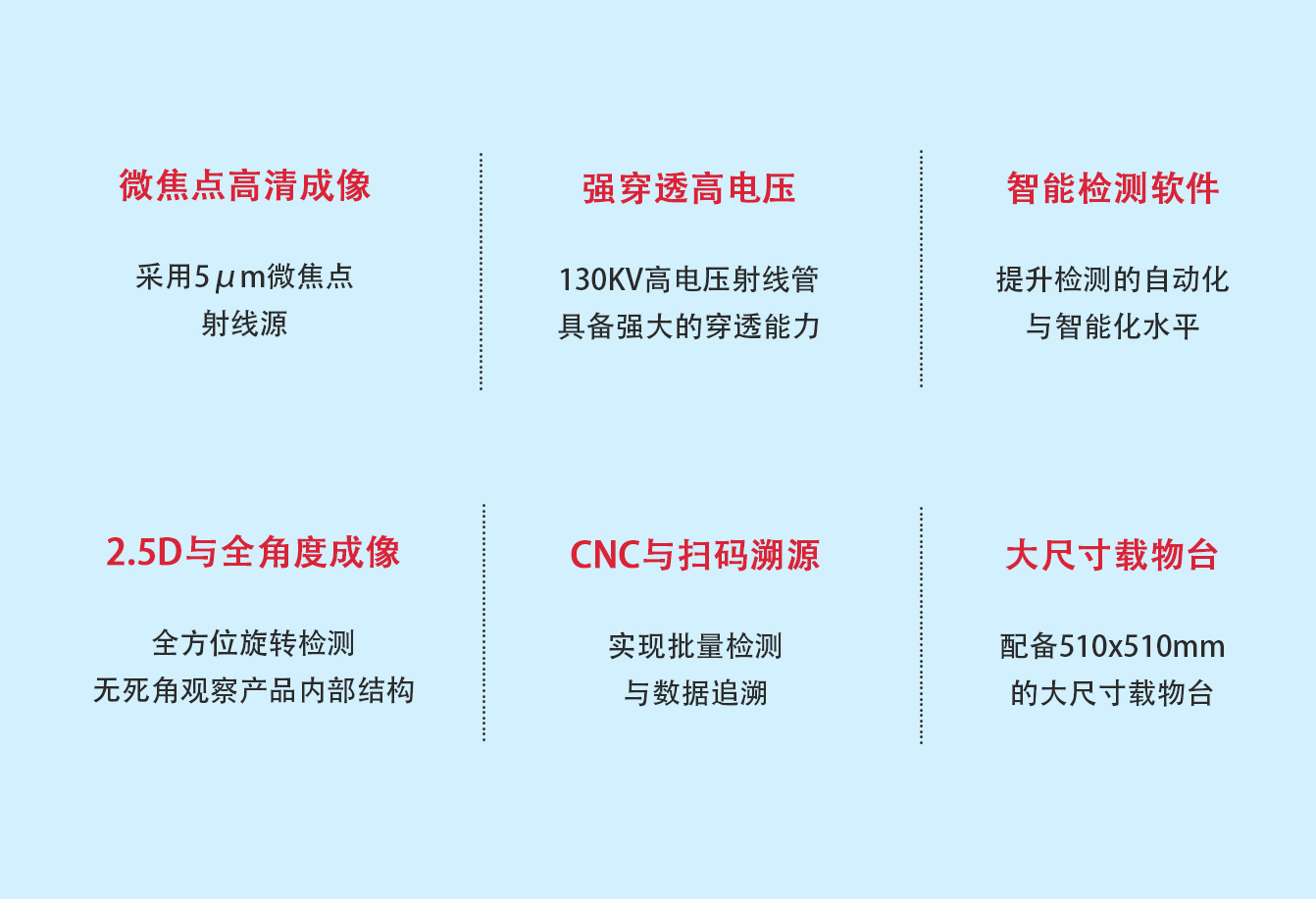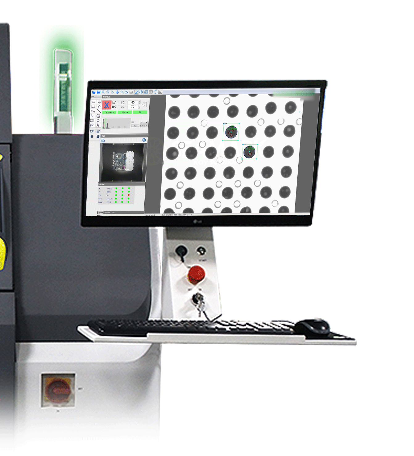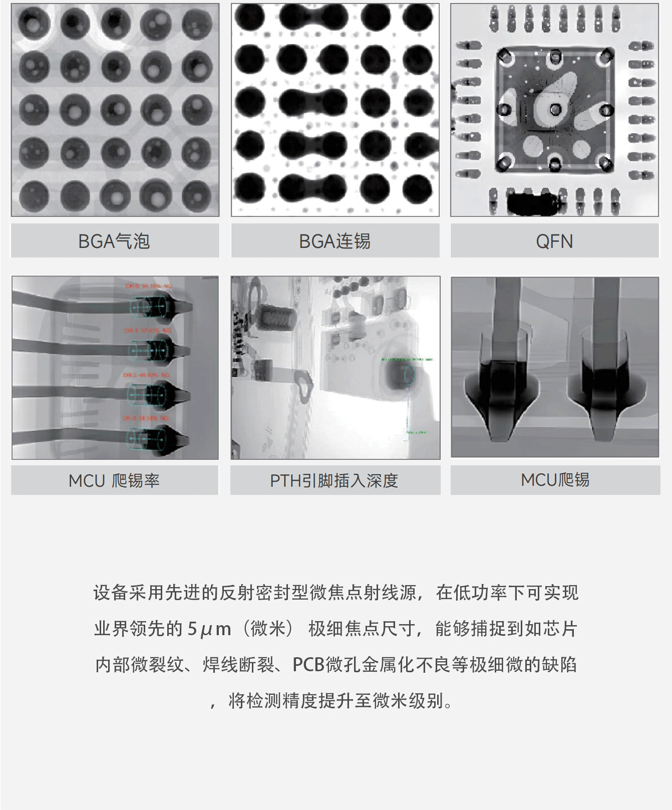 X7600B是一款功能强大的高端精密微焦斑X射线智能检测设备,搭载创新自研智能检测软件及全新一代图像算法,采用高电压射线管设计穿透力强,图像质量高,具备2.5D成像功能,可实现360度、全方位观察产品缺陷,被广泛应用在印刷电路板(PCB)、微芯片(IC)、手机、电源功率器件等产品检测。