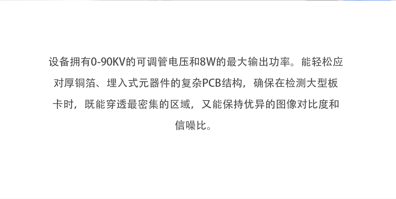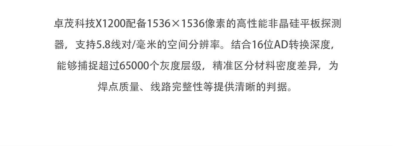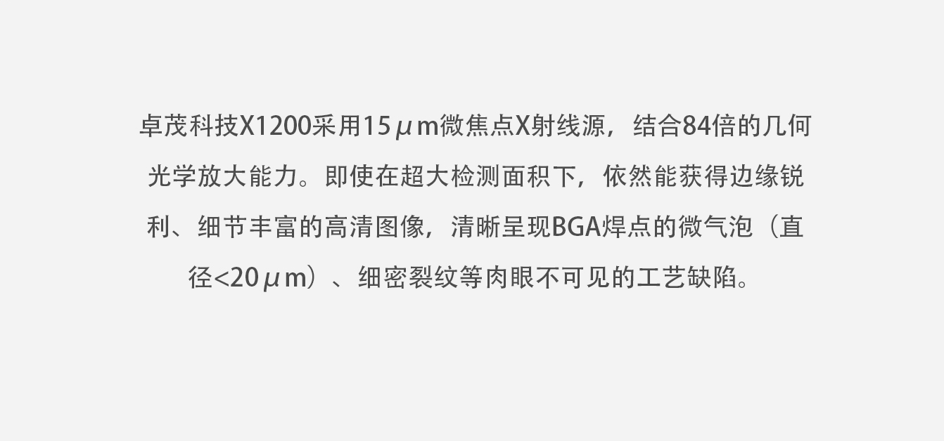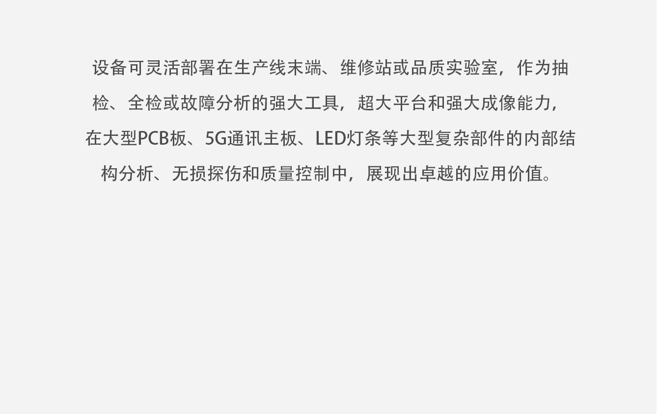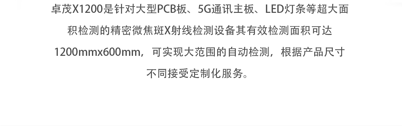 X1200是针对大型PCB板、5G通讯主板、LED灯条等超大面积检测的精密微焦斑X射线检测设备,其有效检测面积可达1200mmx600mm,可实现大范围的自动检测,根据产品尺寸不同接受定制化服务。