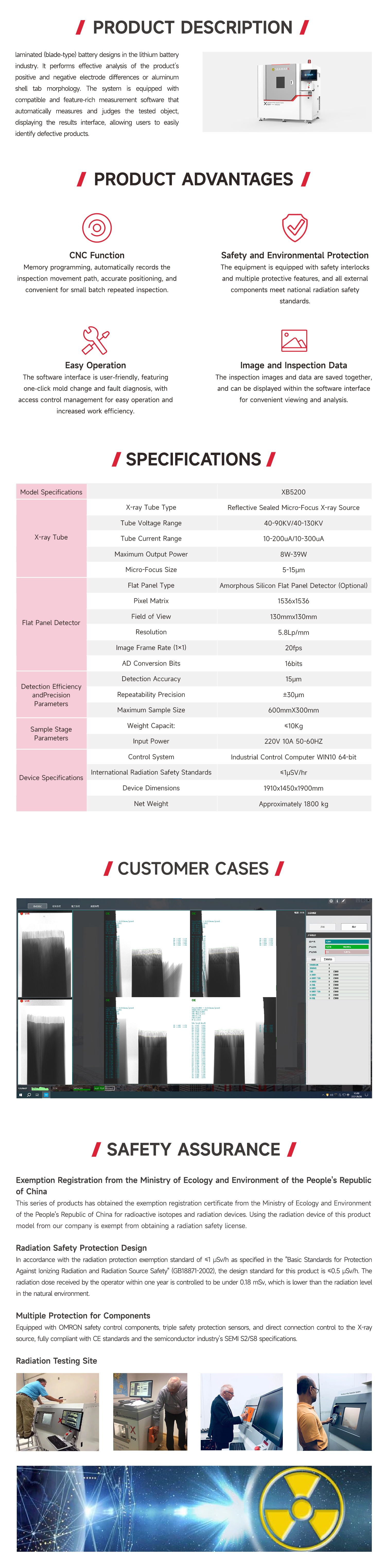 XB5200 stacking battery X-ray inspection equipment is suitable for the inspection of stacking (blade) process type batteries in the lithium battery industry, and conducts effective analysis of the extreme difference between the positive and negative poles of the product or the shape of the aluminum shell pole ear; it is equipped with highly compatible and fully functional measurement software, automatically measures and automatically judges the object being measured, and displays the judgment result interface, so that users can easily pick out defective products.