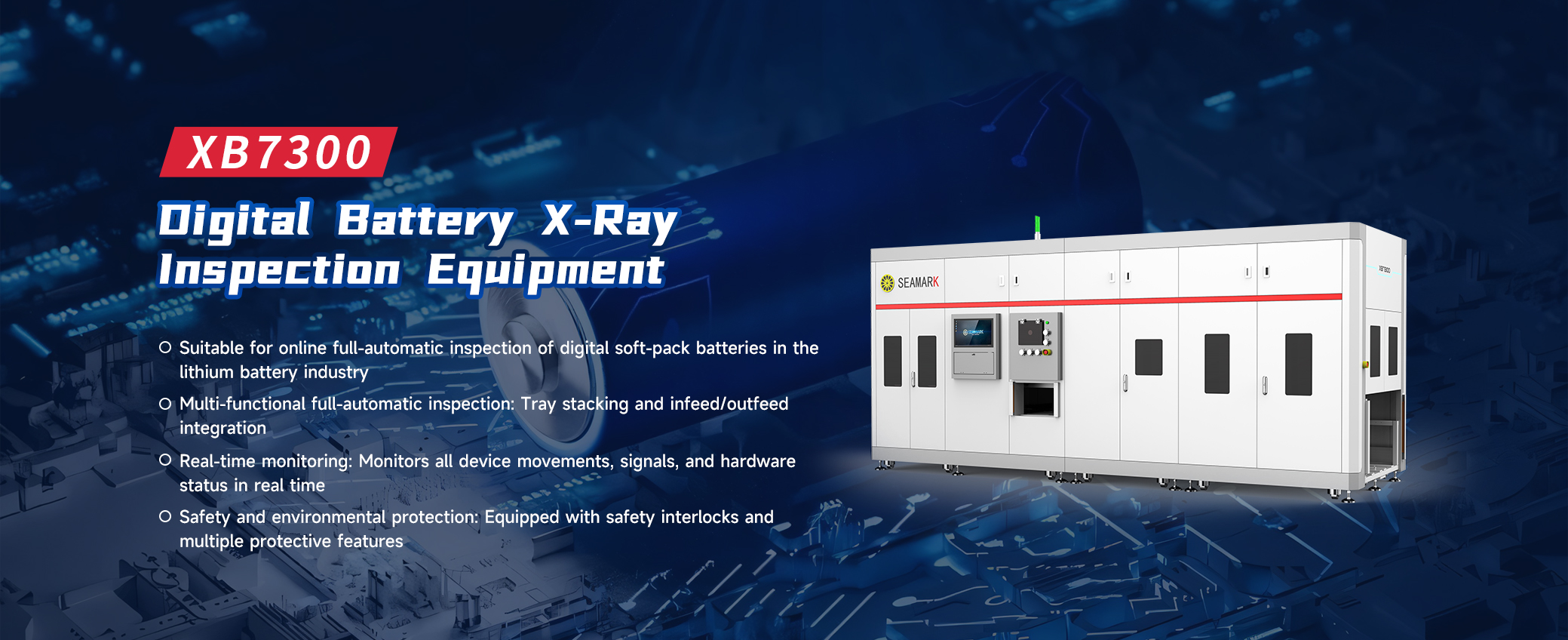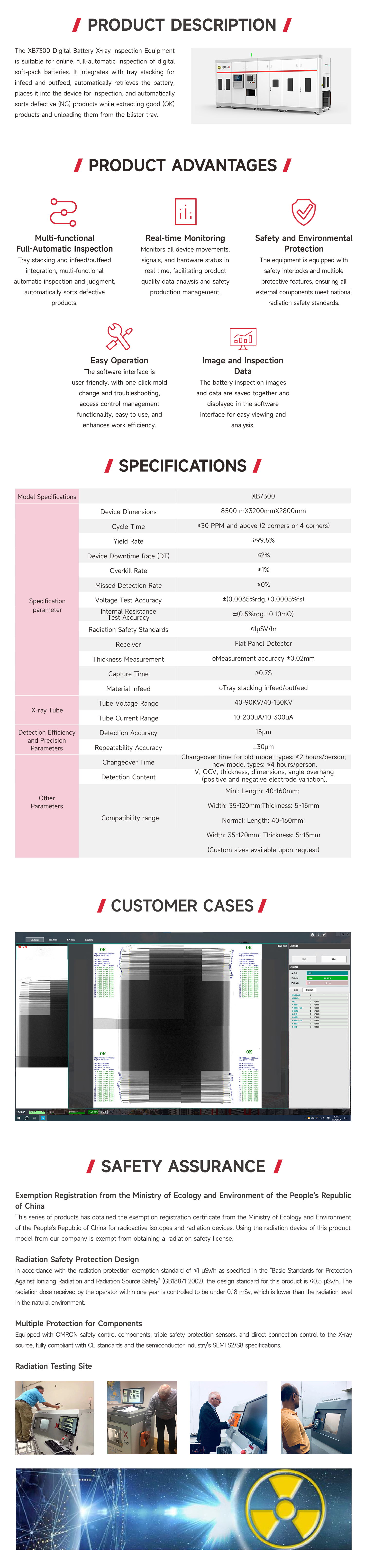 XB7300 digital battery X-ray inspection equipment is designed for fully automatic inline inspection of digital soft-pack batteries. lt features tray stacking and feeding integration, allowing for automatic battery picking, placement into the system for inspection,automatic sorting of NG(defective) products, automatic removal of OK(pass)products, and unloading via blister packaging.