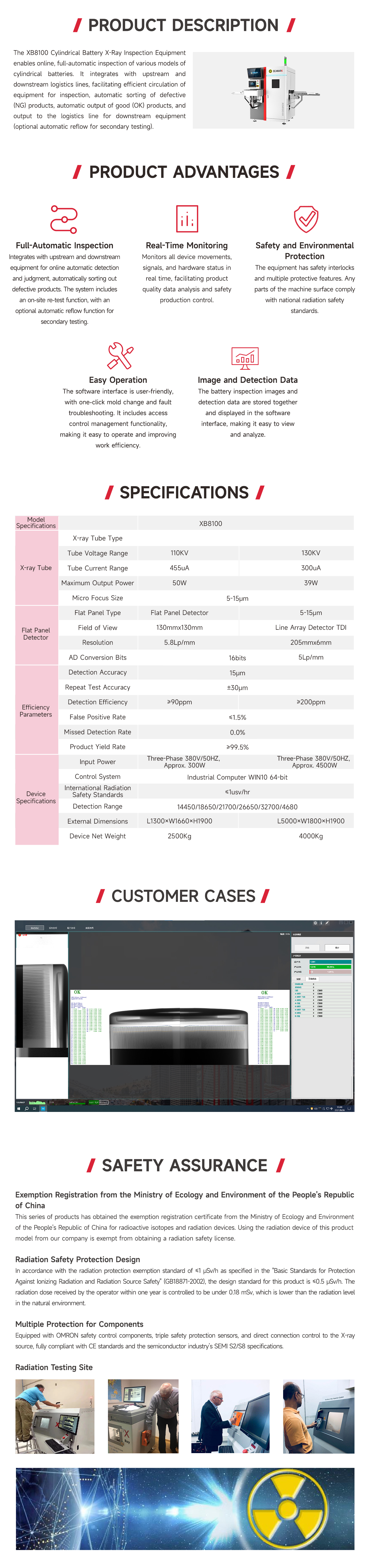XB8100 enables fully automatic inline inspection of various models of cylindrical batteries. It integrates with upstream and downstream logistics lines, allowing for efficient transfer of items for inspection. lt automatically sorts out defective(NG) products and outputs acceptable (OK) products to the output logistics line, which then enters downstream equipment (optional automatic reflow for secondary retesting).