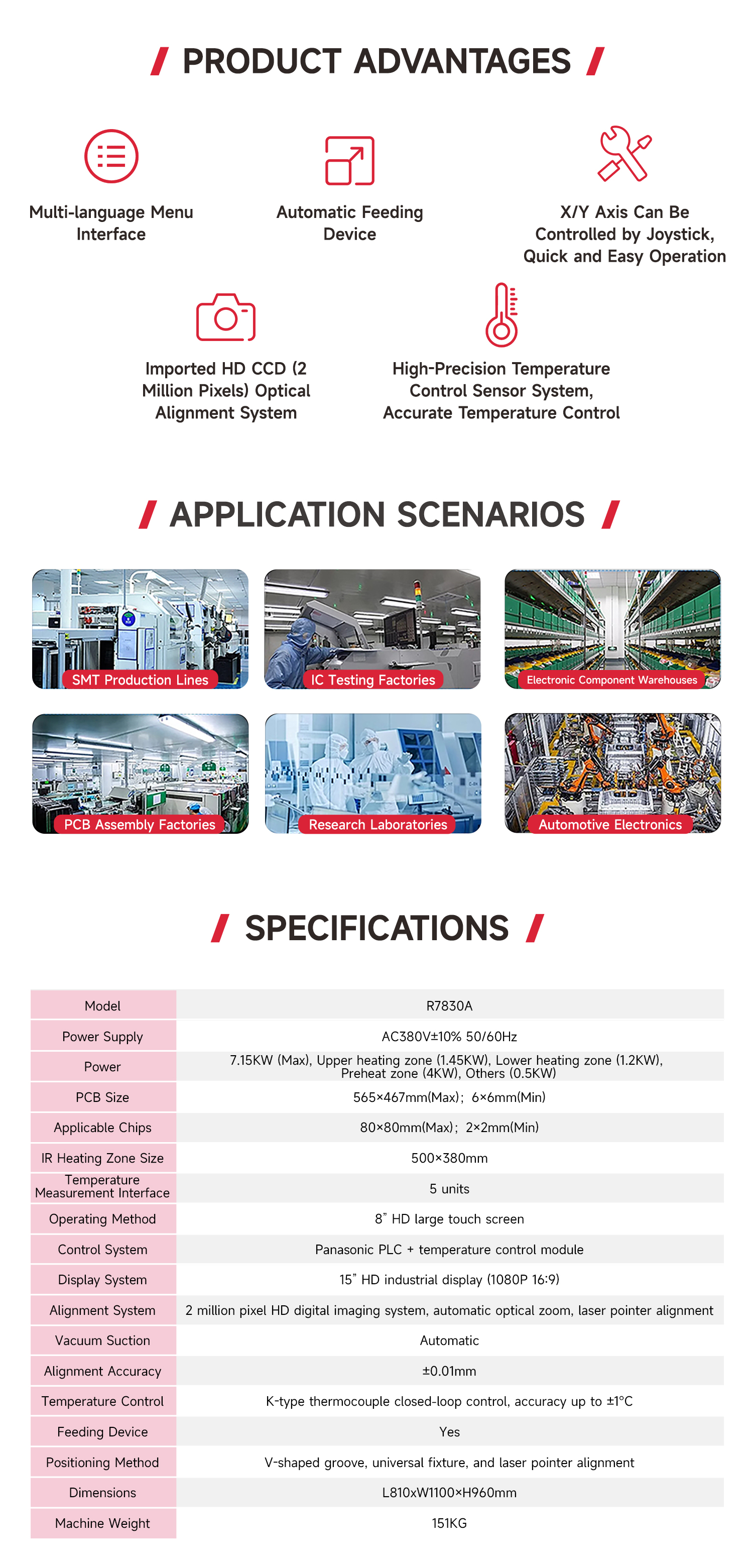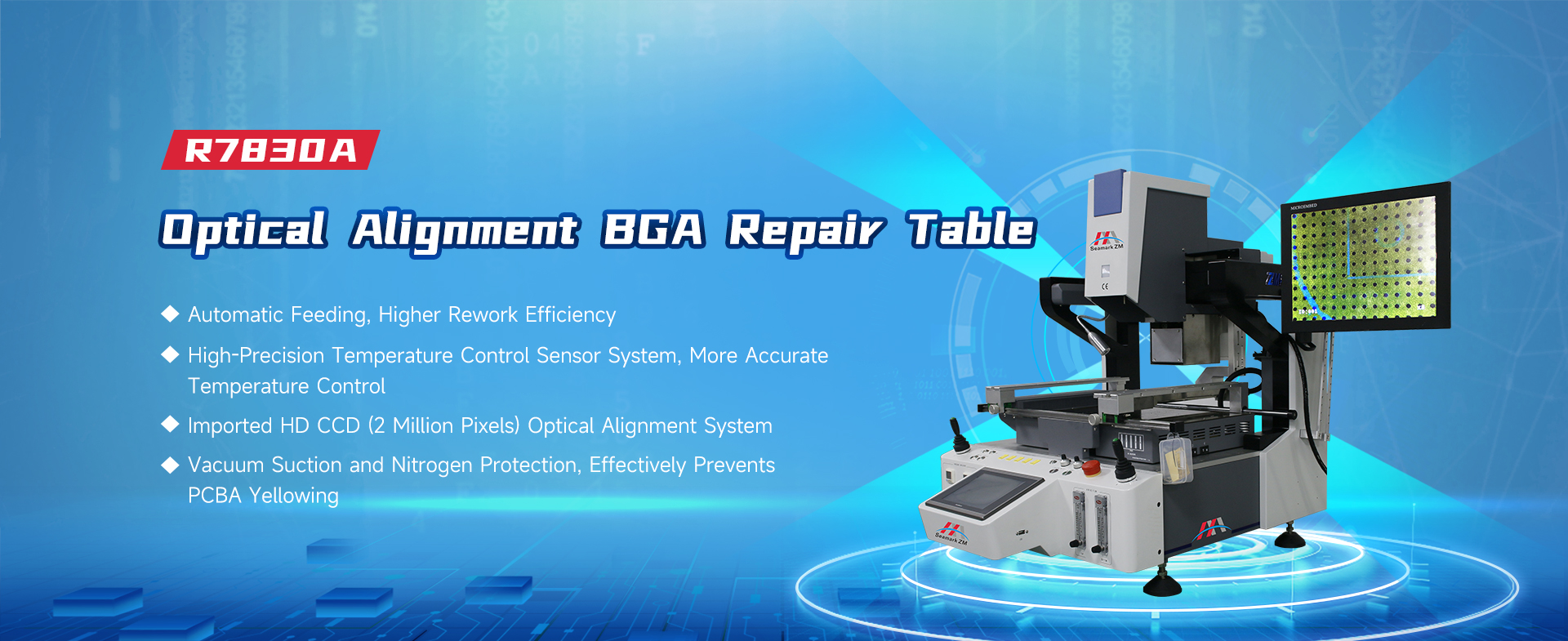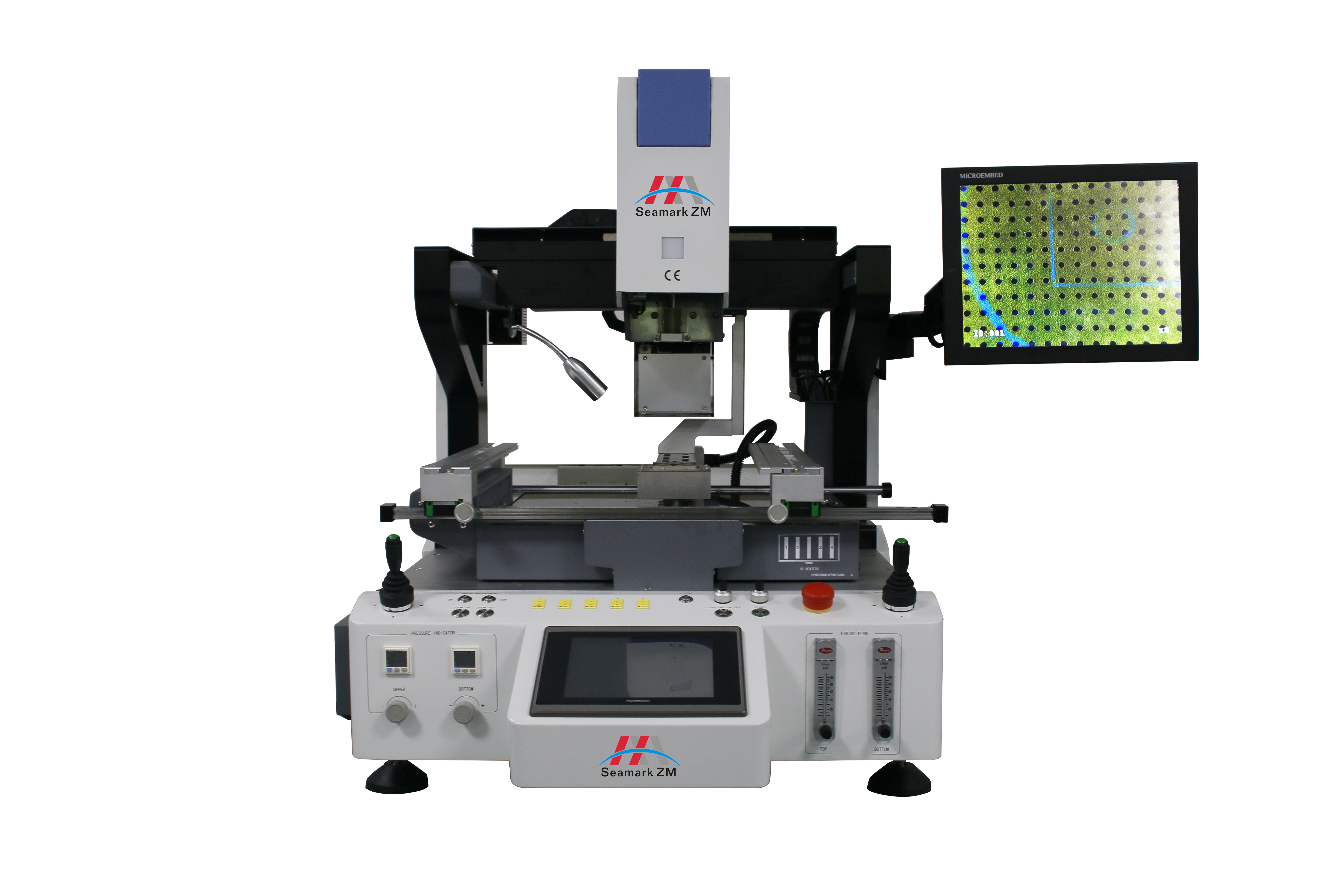 The ZM-R7830A is a cost-effective, general-purpose optical alignment and automatic rework equipment with the following features: a multi-language menu interface, automatic feeding, joystick control of the optical alignment mechanism's x/y axes for quick and easy operation, a high-definition optical alignment system with beam splitting, magnification, reduction, and fine-tuning capabilities, and automatic color resolution and brightness adjustment. A high-precision temperature control sensor system ensures precise temperature control.