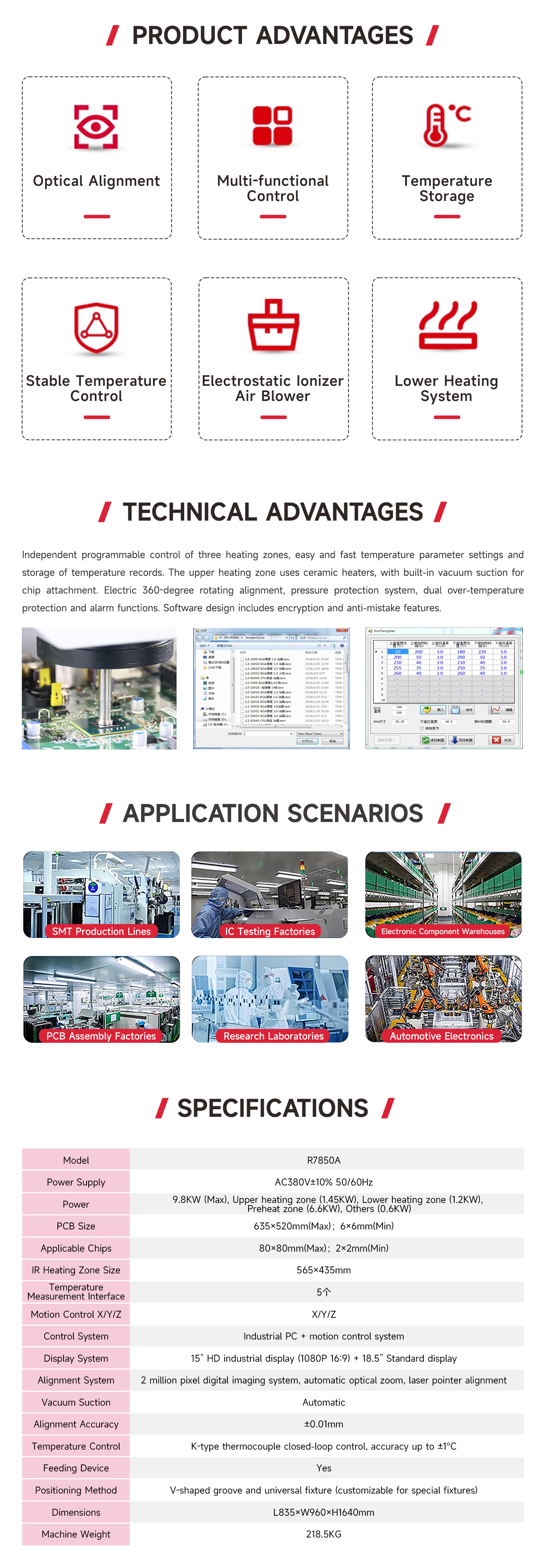 The ZM-R7850A is a multifunctional, floor-standing, PC-controlled optical alignment and automatic rework machine with the following features: a multi-language menu interface, convenient temperature setting and control, a high-definition optical alignment system with beam splitting, magnification, reduction, and fine-tuning capabilities, and a high-precision temperature control sensor system for precise temperature control.