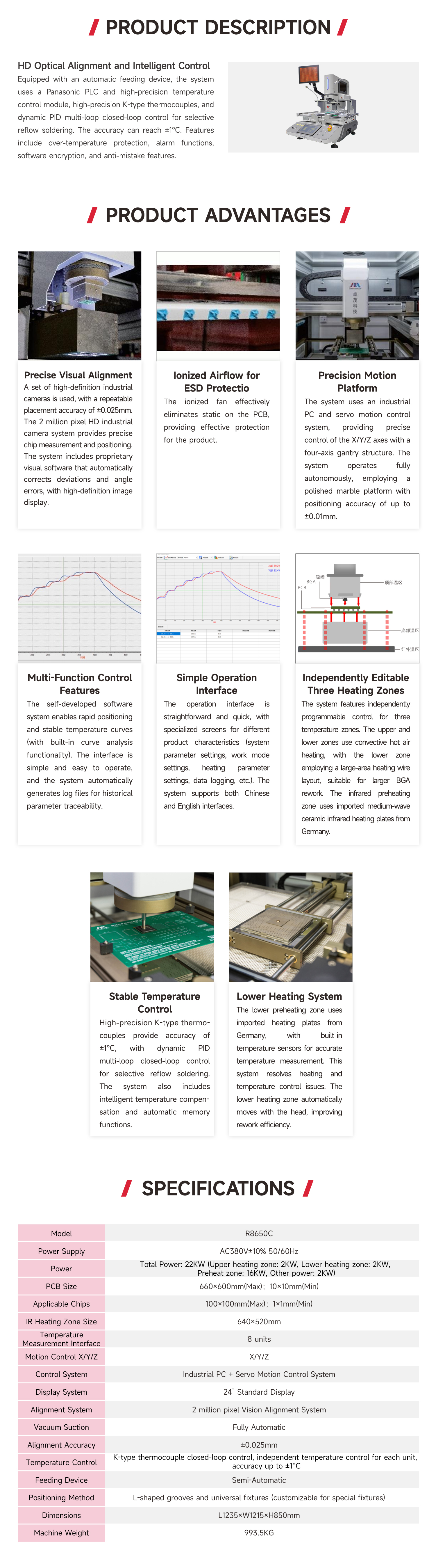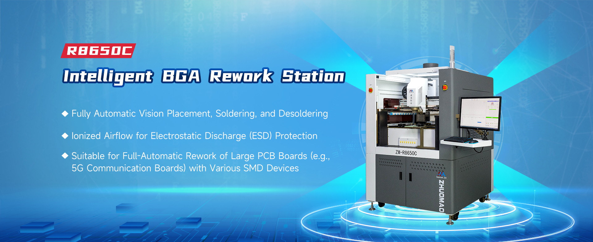 R8650C is a BGA rework station with automatic visual alignment. lt is suitable for automatic rework of various SMD devices on large PCB boards (such as 5G communication boards). lt can realize automatic visual placement, automatic soldering, full automatic rework Automatic desoldering function. lt can be connected with MES software (optional) to realize the functions of temperature curve analysis with S/N as the traceability condition.