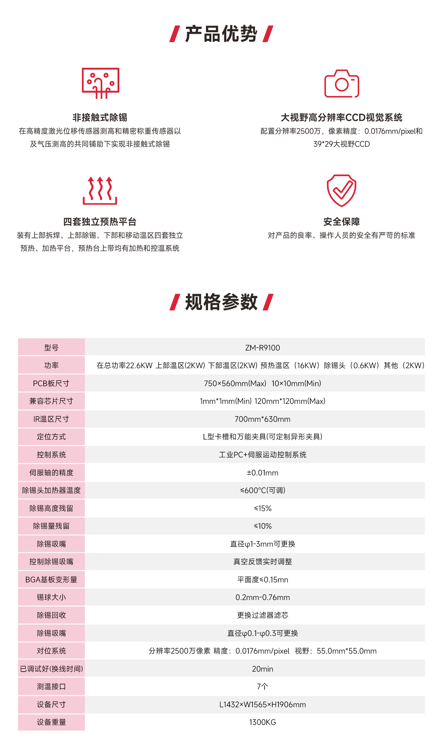 ZM-R9100 is a large-scale multifunctional precision intelligent rework station suitable for fully automatic rework of various surface mounting devices on PCB boards. It adopts high-precision visual cameras and independent temperature control technology, and automatically aligns through the equipment vision system to achieve rework actions such as disassembly, tin removal, dipping solder paste, mounting, and soldering. It supports continuous and fast working mode after fixing fixtures; The equipment can be integrated with MES software (optional) to achieve functions such as temperature curve analysis with S/N as the traceability condition.