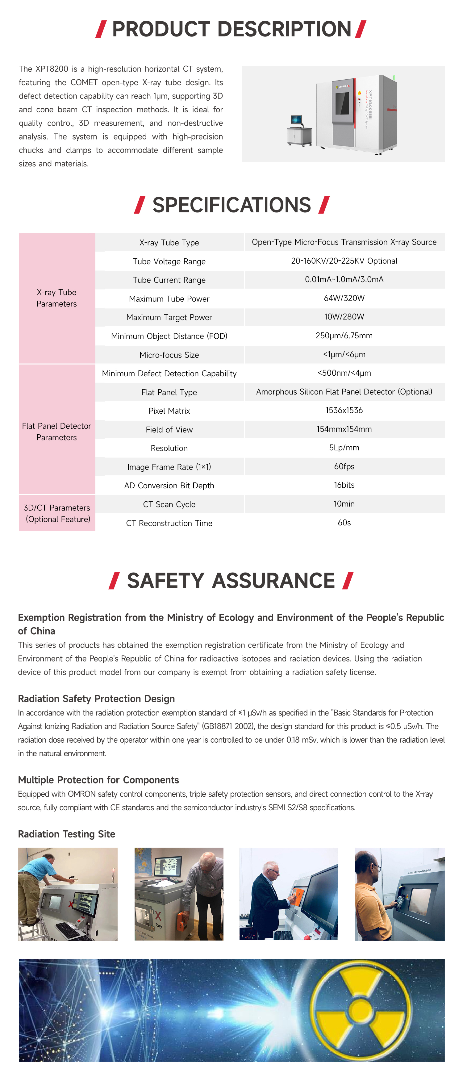 XPT8200 is a high-resolution X-ray 3D perspective inspection system designed with COMET open tubes. It can achieve various CT scanning methods such as standard cone beam CT scanning, standard cone beam extended field CT scanning, spiral CT scanning, etc. It is suitable for industrial manufacturing, quality control and process optimization, electronic device, chip inspection and other scenarios, and can meet the inspection of samples of different sizes and materials.