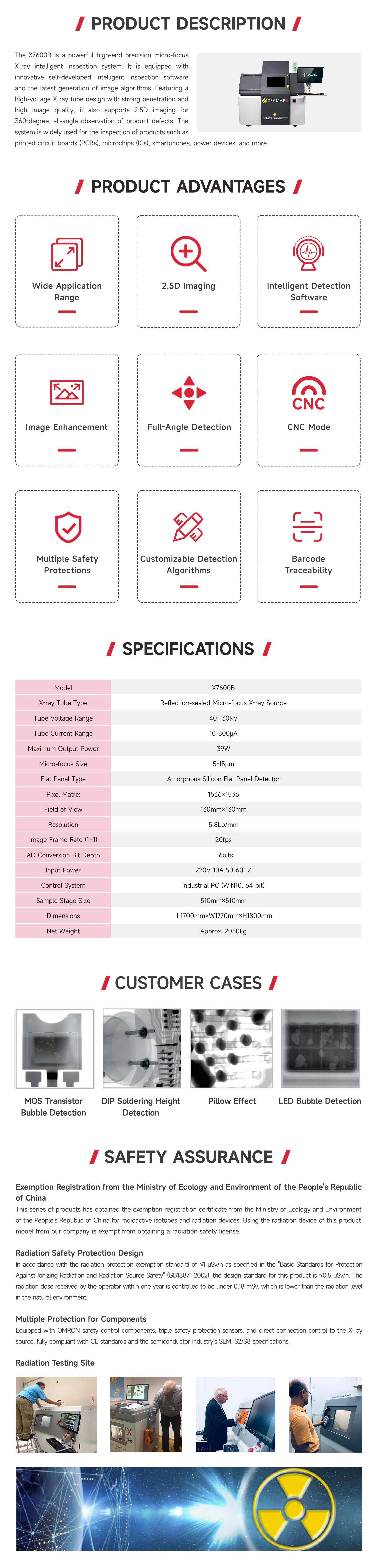 X7600B is a powerful high-end precision micro-focus X-ray intelligent inspection equipment, equipped with innovative self- developed intelligent inspection software and a new generation of image algorithms. lt adopts a high-voltage X-ray tube design with strong penetration and high image quality. lt has a 2.5D imaging function and can achieve 360-degree,all-round observation of product defects. lt is widely used in printed circuit boards(PCBs), microchips (lCs), mobile phones, power devices and other product inspections