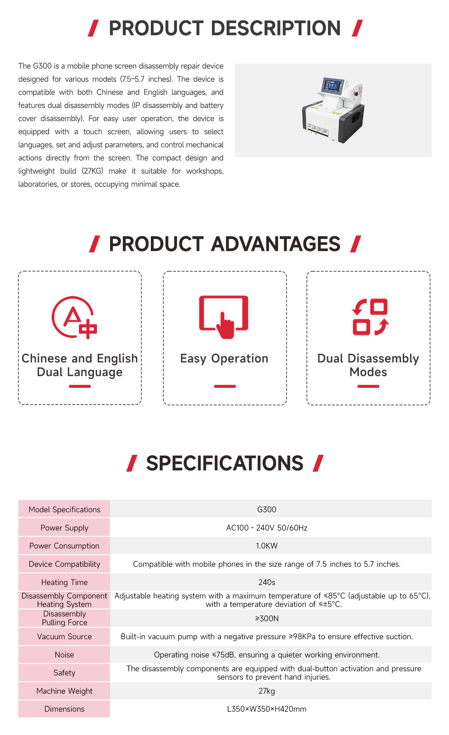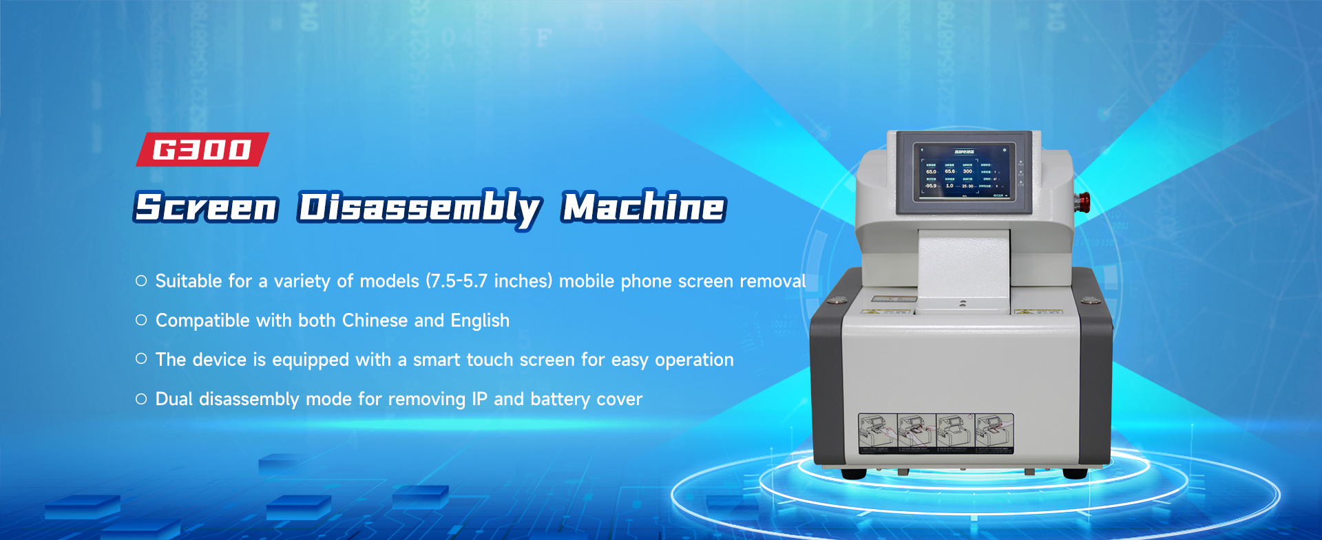 ZM-G300 screen removal machine is a screen removal and repair device for multiple models (7.5-5.7 inches) of mobile phones; This device is compatible with both Chinese and English languages, and also has dual disassembly modes (disassembly of TP and disassembly of battery cover); For the convenience of user operation, the device is equipped with a touch screen, which allows language selection, parameter setting and adjustment, and various mechanism actions to be completed on the touch screen; The device is lightweight and mini, taking up little space, with a total weight of 27KG, suitable for use in workshops, laboratories, or stores.