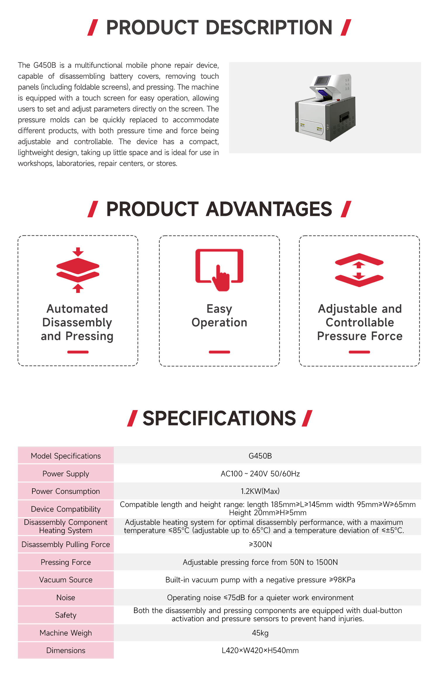 G450B automated disassembly and pressing equipment is a multigunctional device designed for mobile phone repair. It supports functions such as disassembling battery covers, disassembling touch panels (including foldable screens), and pressing. The equipment is equipped with a touchscreen, making it easy for users to operate. Parameters can be set and adjusted directly on the touchscreen. The device also allows for quick replacement of pressure time and force. The compact and lightweight design occupies minimal space, making it suitable for use in workshops, laboratories, repair shops, or retail stores.