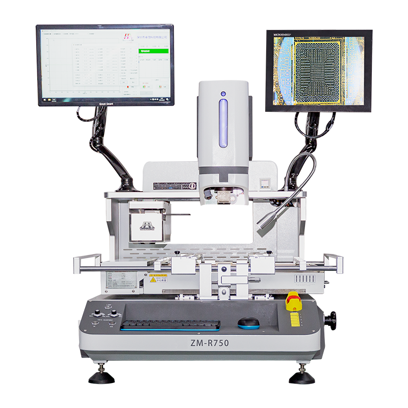 通过PC控制系统进行对位,采用19.5"高清工业显示屏和15"高清工业显示屏操作。独立控制的三温区,对流热风加热,下部温区高度可调,上部温区内置真空吸管,用于芯片吸附,具备负压监控以及压力保护装置;IR预热温区采用碳纤维红外管加热与耐高温微晶面板保护,可左右移动,方便维修大型和不规则PCBA。采用高清CCD高精度光学对位系统,可确保元器件的精确贴装,配置激光红点定位,引导PCB快速定位,贴装系统采用多种工作模式,无需设置繁锁参数。