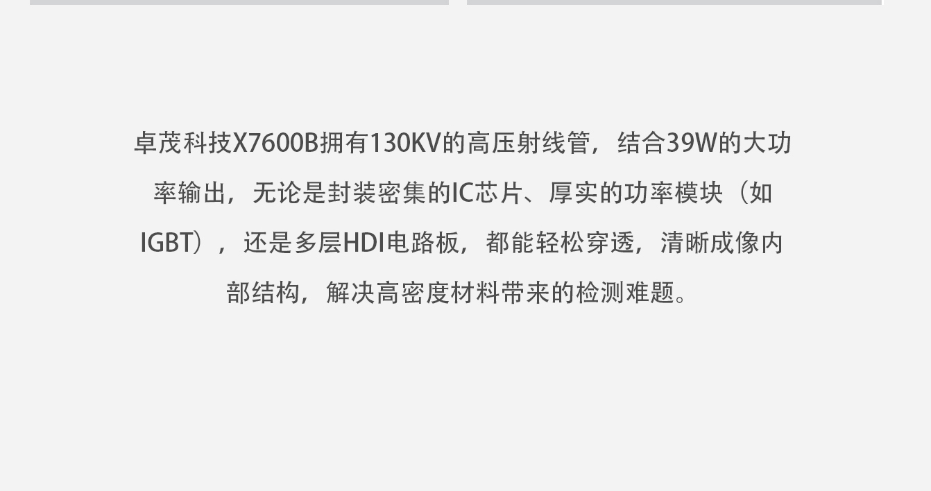 X7600B是一款功能强大的高端精密微焦斑X射线智能检测设备,搭载创新自研智能检测软件及全新一代图像算法,采用高电压射线管设计穿透力强,图像质量高,具备2.5D成像功能,可实现360度、全方位观察产品缺陷,被广泛应用在印刷电路板(PCB)、微芯片(IC)、手机、电源功率器件等产品检测。